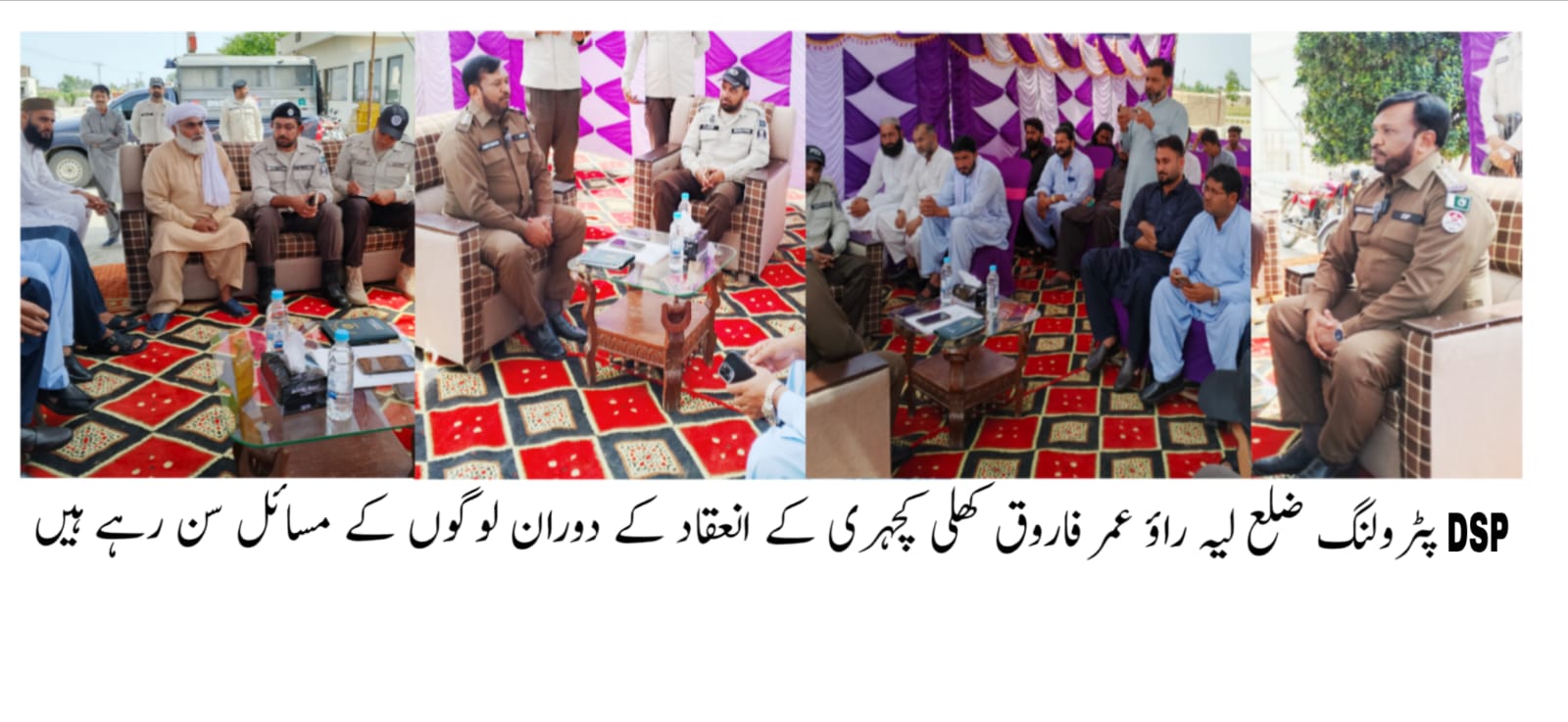 لیہ (نمائندہ لیہ ٹی وی)ایڈیشنل آئی جی پٹرولنگ پولیس پنجاب کے حکم اور ریجنل پولیس آفیسر پنجاب ہائی وے پٹرول ڈیرہ غازی خان ایس پی رانا جان محمد کی ہدایت پر ڈی ایس پی پٹرولنگ ضلع لیہ راؤ عمر فاروق نے پٹرولنگ پوسٹ لدھانہ موڑ کے بیٹ ایریا میں کھلی کچہری کا انعقاد کیا۔ اس موقع پر اہلِ علاقہ کی بڑی تعداد نے شرکت کی اور اپنے مسائل سے آگاہ کیا۔ڈی ایس پی پٹرولنگ راؤ عمر فاروق نے شہریوں کے مسائل تفصیل سے سنے اور موقع پر متعلقہ افسران کو حل کے لیے ضروری ہدایات جاری کیں۔ اس دوران بیٹ ایریا میں موجود ڈرائیور حضرات کو روڈ سیفٹی کے حوالے سے خصوصی بریفنگ بھی دی گئی۔انہوں نے انسانی جانوں کے تحفظ کو اولین ترجیح قرار دیتے ہوئے ٹریفک قوانین پر سختی سے عملدرآمد کی ہدایت کی۔ ڈی ایس پی پٹرولنگ راؤ عمر فاروق نے ڈرائیور حضرات کو اوور اسپیڈنگ، اوور لوڈنگ آف پیسنجرز، لین اینڈ لائن کی پابندی، دورانِ ڈرائیونگ موبائل فون کے استعمال سے اجتناب اور خصوصا موٹر سائیکل سوار کو ہیلمٹ کا لازمی استعمال کرنے اور سیٹ بیلٹ کے لازمی استعمال کی تاکید کی۔انہوں نے مزید واضح کیا کہ ٹریفک قوانین کی خلاف ورزی کرنے والوں کے خلاف بلا امتیاز قانونی کارروائی عمل میں لائی جائے گی۔عوام الناس کی جان کے تحفظ کو ہر صورت یقینی بنایا جائے گا ۔