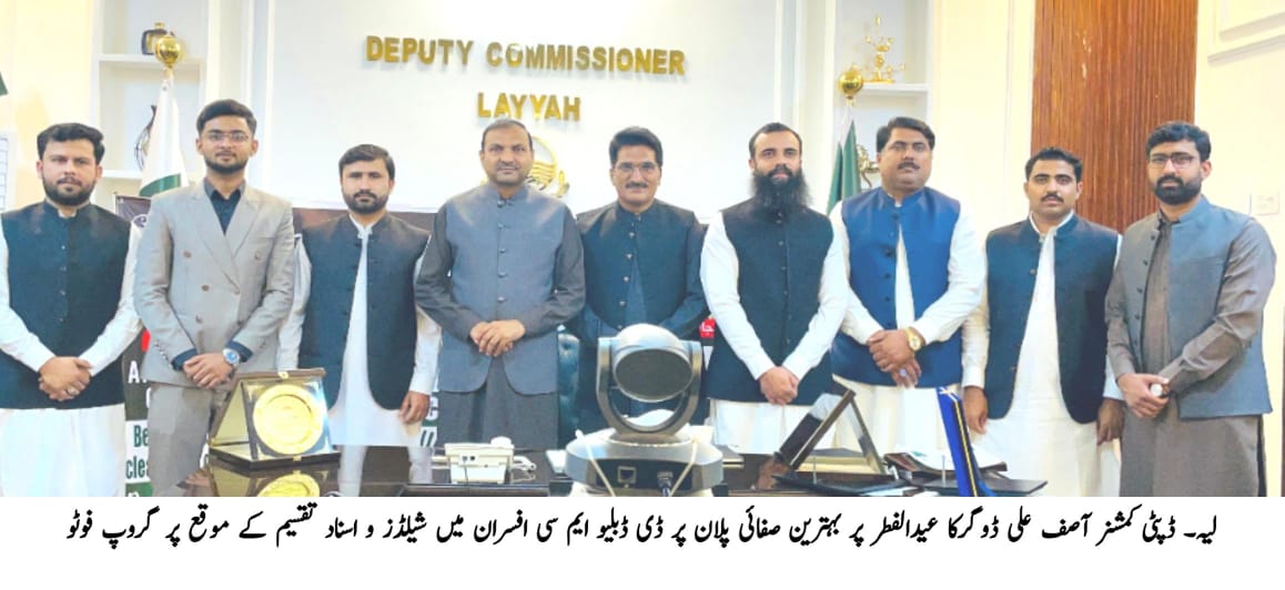 لیہ(نمائندہ لیہ ٹی وی)ڈپٹی کمشنر آصف علی ڈوگر نے عیدالفطر کے موقع پر صفائی کے بہترین انتظامات پر ڈی ڈبلیو ایم سی کے افسران میں اعزازی شیلڈز اور اسناد تقسیم کیں۔ اس موقع پر ایڈیشنل ڈپٹی کمشنر جنرل شبیر احمد ڈوگر بھی موجود تھے۔ڈپٹی کمشنر نے ریجنل منیجر لیہ مدثر جاوید، ڈسٹرکٹ منیجر خوشحال خان بزدار،تحصیل منیجرز دانیال فیض، قدرت اللہ، فیصل نیاز،سکندر ابراہیم میں اعزازی شیلڈز اور اسناد تقسیم کیں۔ڈپٹی کمشنر آصف علی ڈوگر نے اس موقع پر کہا کہ وزیراعلیٰ پنجاب مریم نواز شریف کی ہدایت پر صوبہ بھر میں صفائی کے نظام کو مزید بہتر بنایا جا رہا ہے اور ستھرا پنجاب مہم ایک مؤثر اور انقلابی اقدام ہے جس کی ماضی میں مثال نہیں ملتی۔انہوں نے کہا کہ عیدالفطر کے موقع پر شہریوں کو صاف ستھرا ماحول فراہم کرنے کے لیے خصوصی صفائی پلان تشکیل دیا گیا جس پر ڈی ڈبلیو ایم سی کی ٹیم نے ذمہ داری اور محنت کے ساتھ عملدرآمد کیا۔انہوں نے کہا کہ عید کے دنوں میں مساجد، عید گاہوں، مرکزی شاہراہوں، بازاروں اور رہائشی علاقوں میں صفائی کے بہترین انتظامات کو یقینی بنایا گیا جس سے شہریوں کو خوشگوار ماحول میسر آیا۔انہوں نے افسران و عملہ کی کارکردگی کو سراہتے ہوئے کہا کہ فیلڈ ٹیموں نے بروقت صفائی،ویسٹ کلیکشن اور عمومی صفائی ستھرائی کے عمل کو احسن انداز میں جاری رکھا جو قابل تحسین ہے۔ڈپٹی کمشنر نے ہدایت کی کہ صفائی کے اس معیار کو برقرار رکھا جائے شہریوں کو صاف ماحول کی فراہمی ضلعی انتظامیہ کی اولین ترجیح ہے اور اس مقصد کے لیے تمام دستیاب وسائل بروئے کار لائے جا رہے ہیں جبکہ عوام میں صفائی کے حوالے سے شعور اجاگر کرنا بھی نہایت ضروری ہے تاکہ یہ عمل مستقل بنیادوں پر جاری رہ سکے۔ڈپٹی کمشنر نے ڈی ڈبلیو ایم سی کے افسران و عملہ کی خدمات کو سراہتے ہوئے اس امید کا اظہار کیا کہ وہ آئندہ بھی اسی جذبے اور محنت کے ساتھ اپنی ذمہ داریاں ادا کرتے رہیں گے اور ضلع میں صفائی کے نظام کو مزید بہتر بنانے میں اپنا مؤثر کردار جاری رکھیں گے۔