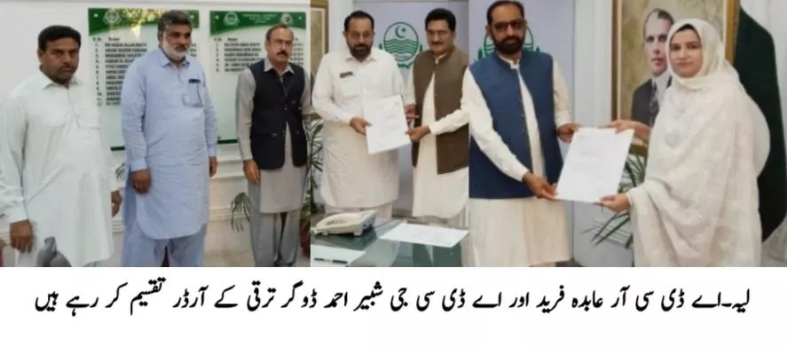لیہ(نمائندہ لیہ ٹی وی )ایڈیشنل ڈپٹی کمشنر ریونیو عابدہ فرید نے ڈسٹرکٹ پروموشن کمیٹی کے تحت ترقی پانے والے اہلکاروں کو قانون گو کے عہدے پر ترقی کے آرڈرز جاری کیے۔ اس موقع پر جنرل شبیر احمد ڈوگر اور سپریٹنڈنٹ طارق جاوید بھی موجود تھے۔اے ڈی سی آر عابدہ فرید نے فتح محمد، محمد اسلم، رانا مشکور، رفیق، اقبال اور جام ریاض کو ترقی کے آرڈرز دیے گئے اور ان کو مبارک باد دی۔ایڈیشنل ڈپٹی کمشنر ریونیو عابدہ فرید نے اس موقع پر کہا کہ ترقی یافتہ اہلکار اپنے فرائض کو ایمانداری اور محنت کے ساتھ سرانجام دیتے ہوئے عوام کے لیے بہترین خدمات فراہم کریں۔ انہوں نے مزید کہا کہ ضلعی انتظامیہ اہلکاروں کی کارکردگی کو سراہتی ہے اور ترقی کے مواقع اہلکاروں کی محنت اور قابلیت کے مطابق فراہم کیے جاتے رہیں گے۔ ایڈیشنل ڈپٹی کمشنر نے ترقی پانے والے اہلکاروں کی محنت کو مثالی قرار دیتے ہوئے کہا کہ یہ اقدامات دیگر اہلکاروں کے لیے بھی حوصلہ افزائی کا سبب بنیں گے۔