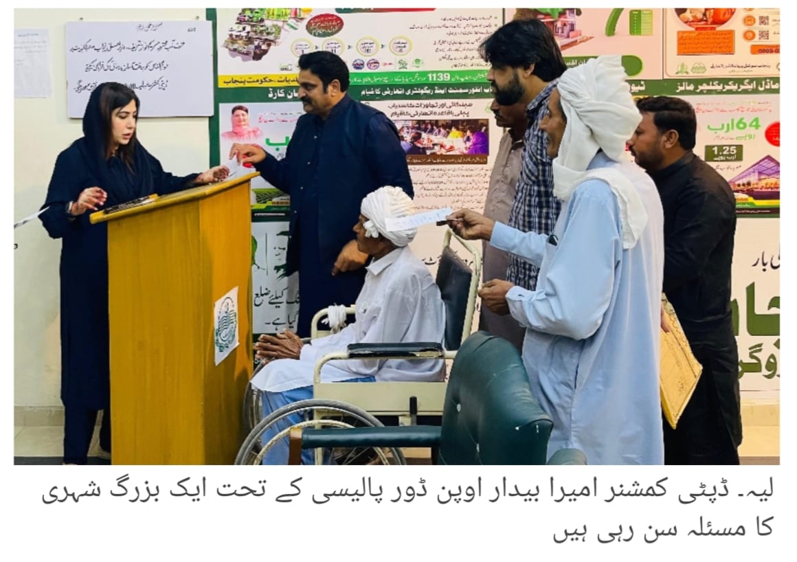 لیہ(نمائندہ لیہ ٹی وی)وزیر اعلیٰ پنجاب مریم نواز شریف کے وژن کے مطابق شہریوں کی مسائل کے فوری حل کے لئے اقدامات جاری ہیں۔ ڈپٹی کمشنر امیرا بیدار نے اس سلسلہ میں اوپن ڈور پالیسی کے تحت اپنے دفتر میں شہریوں کے مسائل سنے اور ان کی درخواستوں پر موقع پر احکامات جاری کئے۔ ڈپٹی کمشنر نے اس موقع پر گفتگو کرتے ہوئے کہا کہ وزیر اعلیٰ پنجاب مریم نواز شریف کی طرف سے عام آدمی کے مسائل کے بروقت حل کے لئے خصوصی ہدایات ہیں۔ انہوں نے کہا کہ گڈ گورننس، میرٹ اور شفافیت کو برقرار رکھنے کے لئے ضلع بھر میں اوپن ڈور پالیسی اور کھلی کچہریوں کا باقاعدہ سلسلہ جاری ہے اور متعلقہ افسران عوام کے مسائل کے حل کے لئے کوشاں ہیں۔ انہوں نے کہا کہ ڈی سی آفس کے دروازے شہریوں کے لئے کھلے ہیں اور وہ اپنے مسائل کے حل کے لئے رجوع کر سکتے ہیں۔