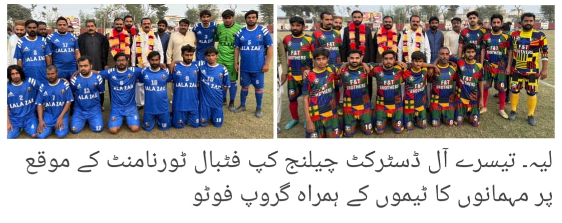 لیہ( نمائندہ لیہ ٹی وی) ضلعی انتظامیہ کے زیر اہتمام تیسرا آل ڈسٹرکٹ چیلنج کپ فٹبال ٹورنامنٹ جاری۔ ٹورنامنٹ میں گزشتہ روز آزاد گرین کلب اور لالہ زار کلب کے مابین سنسنی خیز مقابلہ ہوا۔ میچ کے اختتام پر دونوں ٹیمیں ایک ایک گول سے برابر رہیں۔ بعد ازاں میچ کا فیصلہ پینلٹی ککس پر آزاد گرین فٹبال کلب نے اپنے نام کرلیا۔ پینلٹی شوٹ آؤٹ میں آزاد گرین کلب نے 5 جبکہ لالہ زار کلب 4 گول کر سکی۔ میچ کے مہمان خصوصی محسن دھول اور ظہور میانہ ایڈووکیٹ تھے۔ اس موقع پر شائقین کی بڑی تعداد موجود تھی جنہوں نے ڈپٹی کمشنر امیرا بیدار کی طرف سے فٹبال کھیل کی ترویج کے لئے ٹورنامنٹ کے انعقاد کو قابل ستائش اقدام کرار دیا۔ی) ضلعی انتظامیہ کے زیر اہتمام تیسرا آل ڈسٹرکٹ چیلنج کپ فٹبال ٹورنامنٹ جاری۔ ٹورنامنٹ میں گزشتہ روز آزاد گرین کلب اور لالہ زار کلب کے مابین سنسنی خیز مقابلہ ہوا۔ میچ کے اختتام پر دونوں ٹیمیں ایک ایک گول سے برابر رہیں۔ بعد ازاں میچ کا فیصلہ پینلٹی ککس پر آزاد گرین فٹبال کلب نے اپنے نام کرلیا۔ پینلٹی شوٹ آؤٹ میں آزاد گرین کلب نے 5 جبکہ لالہ زار کلب 4 گول کر سکی۔ میچ کے مہمان خصوصی محسن دھول اور ظہور میانہ ایڈووکیٹ تھے۔ اس موقع پر شائقین کی بڑی تعداد موجود تھی جنہوں نے ڈپٹی کمشنر امیرا بیدار کی طرف سے فٹبال کھیل کی ترویج کے لئے ٹورنامنٹ کے انعقاد کو قابل ستائش اقدام کرار دیا۔