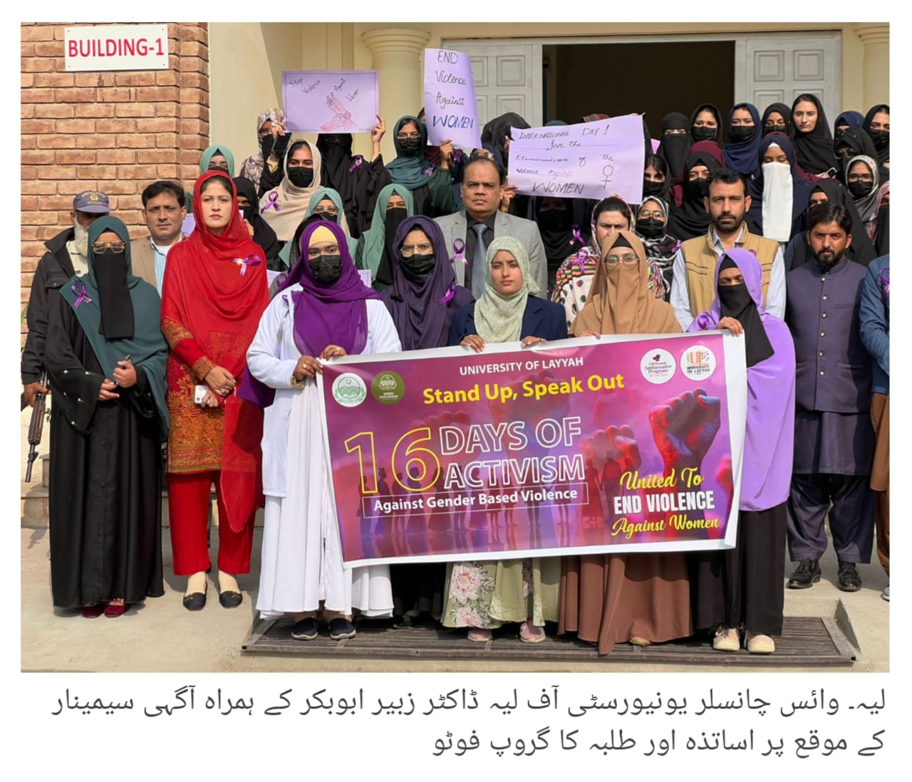 لیہ(نمائندہ لیہ ٹی وی)یونیورسٹی آف لیہ میں جینڈر بیسڈ وائلنس کے خلاف آگاہی ریلی کا انعقاد کیا گیا جس کی قیادت وائس چانسلر پروفیسر ڈاکٹر زبیر ابوبکر اور پروفیسر ڈاکٹر سعدیہ انجم نے کی۔یونیورسٹی آف لیہ میں 16 روزہ جینڈر بیسڈ وائلنس کے خلاف آگاہی مہم کا آغاز کردیا گیا، مہم کے پہلے دن آگاہی ریلی کا انعقاد کیا گیا۔ریلی کی قیادت وائس چانسلر پروفیسر ڈاکٹر زبیر ابوبکر ، پروفیسر ڈاکٹر سعدیہ انجم نے کی،ریلی میں پروفیسر ڈاکٹر اظہر ، پروفیسر ڈاکٹر امبرین شاہجہان واندر نے بھی شرکت کی۔ریلی شرکا نے جینڈر بیسڈ وائلنس کے خاتمے کے حوالے سے نعرے لگائے۔ وائس چانسلر پروفیسر ڈاکٹر زبیر ابوبکر اور پروفیسر ڈاکٹر سعدیہ انجم کا کہنا تھا کہ صنفی تشدد کے خاتمے کے لیے عملی اقدامات جاری ہیں، میرٹ کی بنیاد پر میل ، فی میل سٹوڈنٹس کا یکساں مواقع فراہم کئے جارہے ہیں۔یونیورسٹی آف لیہ میں فی میل کے تحفظ کے لیے بھرپور اقدامات اٹھائے گئے ہیں۔ ریلی شرکا نے اس بات کے عزم کا اظہار کیا کہ صنفی تشدد کے خلاف مہم جاری رہے گی۔ طالبہ ایمبیسڈر بشری محمود کا کہنا تھا کہ جینڈر بیسڈ وائلنس کے خلاف 16 روزہ مہم کے دوران سٹوڈنٹس کو آگاہی دینے کا سلسلہ جاری رہے گا، روزانہ کی بنیاد پر مخلتف سرگرمیوں کے ذریعے جینڈر بیسڈ وائلنس کی آگاہی کا سلسلہ جاری رہے گا۔