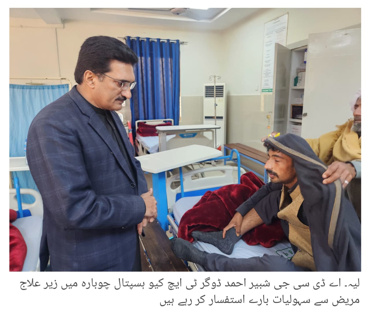 لیہ (نمائندہ لیہ ٹی وی) ڈپٹی کمشنر لیہ امیرا بیدار کی خصوصی ہدایات پر ایڈیشنل ڈپٹی کمشنر جنرل شبیر احمد ڈوگر کا صبح سویرے ٹی ایچ کیو ہسپتال چوبارہ کا اچانک دورہ۔ اس موقع پر انہوں نے مریضوں سے خیریت دریافت کی اور سٹاف کی حاضری، ادویات کی فراہمی، اور مریضوں کو دیگر دی جانے والی سہولیات کے بارے میں جائزہ لیا۔ ایڈیشنل ڈپٹی کمشنر جنرل کا سٹاف کی متعلقہ ڈیسک/ کاؤنٹر پر عدم موجودگی پر سخت اظہار برہمی۔ اے ڈی سی جی نے ہدایت کی کہ ڈیوٹی سٹاف متعلقہ کاؤنٹر پر اپنی موجودگی یقینی بنائیں۔ انہوں نے کہا کہ ہسپتال میں صفائی کے معیار کو مزید بہتر بنایا جائے اور لواحقین سے خوش اخلاقی سے پیش آیا جائے۔ انہوں نے کہا کہ حکومت پنجاب عوام کو مفت علاج معالجے کی سہولیات فراہم کرنے کے لئے بھرپور اقدامات اٹھا رہی ہے۔ ڈاکٹرز اور سٹاف پیشہ مسیحائی کے تقدس کو پیش نظر رکھتے ہوئے اپنے فرائض احسن طریقے سے انجام دیں تاکہ عوام مستفید ہو سکیں۔