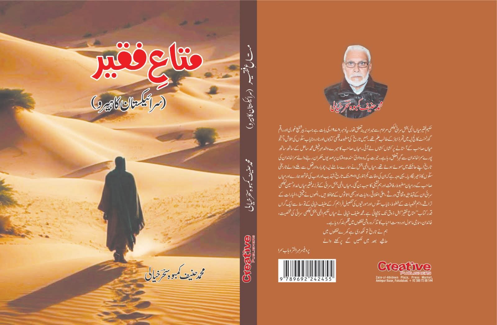 آج جس کتاب کی رونمائی ہو رہی ہے متائے فقیر مصنف مرتبہ محمد حنیف سحر خیالی 123 صفحات پر مشتمل 10واں پر مشتمل یہ کتاب بہت ہی خوبصورت انداز میں شائع کرائی گئی ہے جس میں پروفیسر مہر اختر وہاب جسارت خیالی صابر جازب غلام مصطفی صاحب کے اظہار خیالات موجود ہیں باب اول میں شجرہ نسب دعاؤں میں ولادت با سعادت تھل جو کہ سنسکرت کا لفظ ہے جس کے معنی زائد شدہ زمین کے ہیں پہلی دفعہ اس میں رقم کیا گیا ہے 9 ستمبر 1928 میں ولادت ہوئی اور مورث اعلیٰ کان فقیر لکی کا ذکر بھی اس میں ایا ہے سرائی کی وجہ تسمیہ بلوچ قبیلہ زنگیزہ کا ذکر بھی اس میں شامل ہے اور اس میں اپ کے متعلق بتایا گیا کہ ابتدائی تعلیم مدرسہ مسجد بقا والی مسجد سے حاصل کی چہارم تک اسی مدرسے میں زیر تعلیم رہے اس کے بعد گورنمنٹ ہائی سکول لیہ میں داخل ہوئے1947 تک زیر تعلیم رہے آپ کے کلاس فیلوز میں رادھے شام نارائندرداس گوپی چند نارنگ اور نسیم لیہ کے نام قابل ذکر ہیں یہ بھی اس میں ہم نے پڑھا اور اس کے بعد سرائی تحریک کا جو ذکر کیا گیا میانوال تحریک جو کہ سید محمد جونپوری نے وادیء سندھ میں شروع کی تھی میانوال سے سرائی تحریک کا سفر اس میں ذکر کیا گیا ہے اور رفیق خاور تھلوچی نے روزنامہ آفتاب ملتان 1982 کے شمارے میں لکھا ہے کہ آپ کا تعلق بلوچوں کے زنگیزہ قبیلہ سے تھا جو کہ قصبہ جمالی بلوچاں ضلع شاہ پور موجودہ سرگودھا میں واقع ہے ۔ آدم شاہ حضرت محمد یوسف المعروف لعل عیسن کروڑ سے ملاقات کرتے ہیں اور بندہ کہ ایک مضمون کا حوالہ دیتے ہوئے خاور تھلوچی نے لکھا ہے کہ اپ نے لکھا کہ سرائیکی زبان و ادب کی بہت اپ نے خدمت کی 1958 میں بہاولپور میں پہلی باقاعدہ سرائیکی کانفرنس ہوئی اور اس کے میں اس کے بعد ملتان میں اس کی توثیق توثیح کی اجلاس کیا گیا جس میں قرارداد اپ نے ہی پیش کی جس کی صدارت خان افقلات نے فرمائی منتظمین میں نظام الدین حیدر اور سیٹھ عبید الرحمن کے نام شامل تھے پھر ملتان میں نواب آف بہاولپور کی صدارت میں نظامت برگیڈیر نذیر احمد نے کی اجلاس منعقد ہوا اس زبان کو جسے پہلے ڈیرہ جاتی ملتانی جھٹکی تھولوی اور ریاستی لہجوں میں منقسم کیا گیا تھا فقیر میں الہی بیشک لیکن فارسی کی قدیم کتاب ماثرالاامراء علی شیر قانع بزبان فارسی کا حوالہ دیا اور جسے حاضرین نے تائید کر کے قرارداد منظور کی اور پاس کی اور اسی میٹھی زبان کو باقاعدہ نام سرائیکی دیا گیا اس حوالے کو آپ پھر اپ نے پھر 23 دسمبر 1960ء کو ہفت روزہ بشارت مظفرگڑھ میں شے کرایا اپنے تحقیقی مضمون سرائیکی زبان کی وجہ تسمیہ میں شاعر کرایا اسی مضمون کو سرائیکی ترجمے کے ساتھ پروفیسر سجاد حیدر پرویز نے سرائیکی ادب ملتان میں شائع کرایا مرحوم اسماعیل اہمدانی نے 23 مئی 1995 میں نوائے وقت ملتان میں باعنوان سرائیکی وسیب کی بادشاہ گھر قوم کے عنوان سے لکھا
