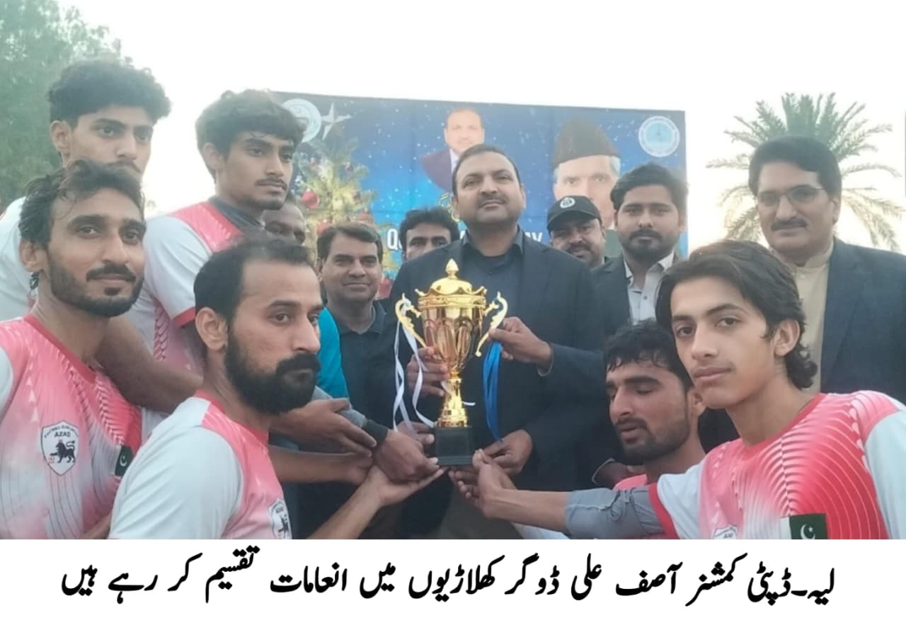 لیہ(نمائندہ لیہ ٹی وی)قائد اعظم ڈے اور کرسمس کے موقع پر محکمہ سپورٹس کے زیر اہتمام فٹ بال میچ کا انعقاد کیا گیا جو چٹان کلب اور آزاد کلب کے درمیان کھیلا گیا۔ میچ کے مہمان خصوصی ڈپٹی کمشنر آصف علی ڈوگر تھے۔ اس موقع پر ایڈیشنل ڈپٹی کمشنر جنرل شبیر احمد ڈوگر،اسسٹنٹ کمشنر زہیب کریم،ڈسٹرکٹ سپورٹس آفیسر امتیاز احمد بھٹی ودیگر افسران و شہریوں کی بڑی تعداد موجود تھی۔کانٹے دار مقابلے کے بعد چٹان کلب نے شاندار کارکردگی کا مظاہرہ کرتے ہوئے میچ اپنے نام کر لیا۔اس موقع پر خطاب کرتے ہوئے ڈپٹی کمشنر اصف علی ڈوگر نے کہا کہ کھیل نوجوانوں کو جسمانی طور پر چاک و چوبند رکھنے کے ساتھ ساتھ نظم و ضبط، ٹیم ورک اور مثبت سوچ کو فروغ دیتے ہیں۔ انہوں نے کہا کہ قائد اعظم محمد علی جناح نوجوانوں کو قوم کا قیمتی اثاثہ قرار دیتے تھے اور ہمیشہ صحت مند، متحرک اور باکردار نوجوان نسل پر زور دیتے رہے۔ آج کے دور میں کھیلوں کی سرگرمیاں اسی فکر کا عملی مظہر ہیں جو نوجوانوں کو مثبت سمت میں آگے بڑھنے کا موقع فراہم کرتی ہیں۔ڈپٹی کمشنر نے مزید کہا کہ حکومت پنجاب نوجوانوں کو صحت مند سرگرمیوں کی طرف راغب کرنے اور کھیلوں کے فروغ کے لیے عملی اقدامات کر رہی ہے تاکہ نئی نسل کو تعمیری اور مثبت ماحول فراہم کیا جا سکے۔آخر میں انہوں نے تمام کھلاڑیوں سے فرداً فرداً ملاقات کی کامیاب ٹیم کو مبارکباد دی اور امید ظاہر کی کہ مستقبل میں بھی ایسے مقابلے نوجوانوں کی صلاحیتوں کو نکھارنے میں اہم کردار ادا کرتے رہیں گے۔