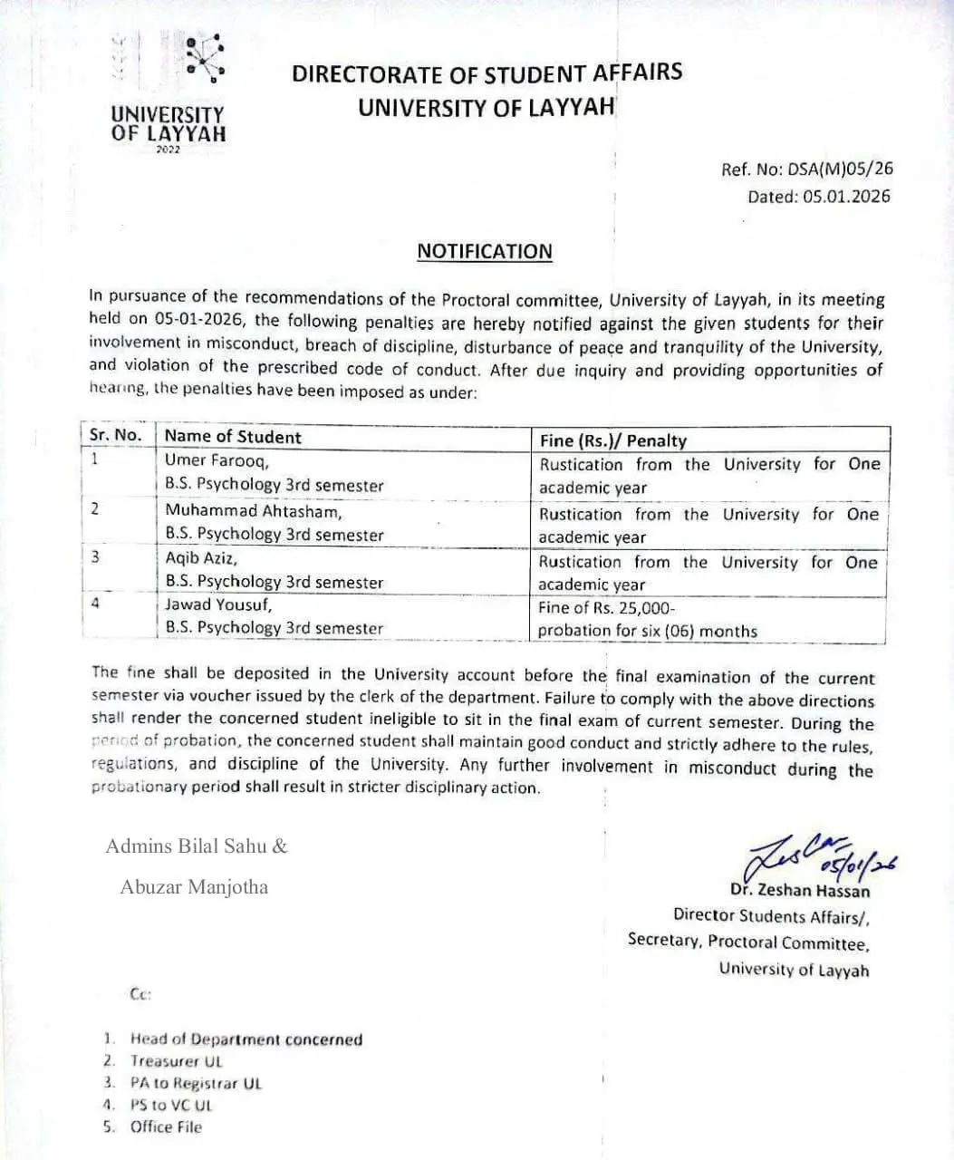 لیہ (نمائندہ لیہ ٹی وی) یونیورسٹی آف لیہ کے ڈائریکٹوریٹ آف اسٹوڈنٹ افیئرز نے پروکٹرل کمیٹی کی سفارشات کی روشنی میں نظم و ضبط کی خلاف ورزی پر شعبہ بی ایس سائیکالوجی کے چار طلبہ کے خلاف تادیبی کارروائی کا نوٹیفکیشن جاری کردیا ہے۔ جاری کردہ نوٹیفکیشن کے مطابق طلبہ پر بدسلوکی، نظم و ضبط کی خلاف ورزی اور یونیورسٹی کے ماحول میں خلل ڈالنے کے الزامات ثابت ہوئے جس پر انہیں سزائیں دی گئی ہیں۔جاری نوٹیفیکشن کے مطابق عمر فاروق (3rdسمسٹر)، محمد احتشام (3rdسمسٹر)، عاقب عزیز (3rdسمسٹر)کو ایک سال کے لیے یونیورسٹی سے Rusticate خارج کردیا گیا ہے۔جبکہ جواد یوسف (3rdسمسٹر)پر 25 ہزار روپے جرمانہ عائد کرتے ہوئے انہیں چھ ماہ کے لیے پروبیشن پر رکھ دیا گیا ہے۔یونیورسٹی انتظامیہ کے مطابق جرمانہ موجودہ سمسٹر کے فائنل امتحان سے قبل جمع کرانا ہوگا، بصورت دیگر متعلقہ طالبعلم امتحان میں بیٹھنے کا اہل نہیں ہوگا۔ مزید یہ کہ پروبیشن کے دوران کسی بھی قسم کی بدسلوکی یا خلاف ورزی کی صورت میں مزید سخت کارروائی کی جائے گی۔نوٹیفکیشن ڈائریکٹر اسٹوڈنٹ افیئرز اور سیکرٹری پروکٹرل کمیٹی ڈاکٹر ذیشان حسن کے دستخط سے جاری کیا گیا۔