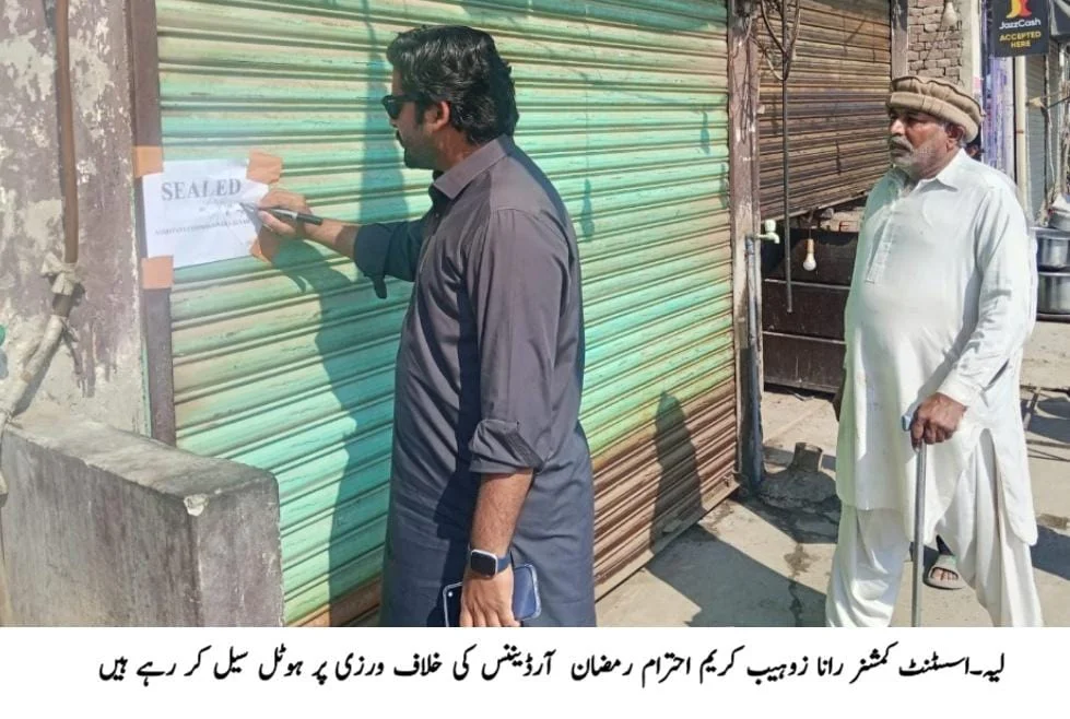 لیہ(نمائندہ لیہ ٹی وی ) اسسٹنٹ کمشنر لیہ رانا زوہیب کریم نے ماہ مقدس رمضان المبارک کے تقدس اور احترام کو یقینی بنانے کے لئے مختلف علاقوں میں ہوٹلوں کا معائنہ کیا۔انہوں نے اس دوران احترام رمضان آرڈیننس کی خلاف ورزی پر ہوٹلوں کو سیل کر دیا۔انہوں نے اس موقع پر کہا کہ حکومت پنجاب کی ہدایات کے مطابق رمضان المبارک میں دن کے اوقات میں کھلے عام کھانے پینے کی اشیاء کی فروخت کسی صورت برداشت نہیں کی جائے گی۔ انہوں نے کہا کہ احترام رمضان آرڈیننس پر عملدرآمد ہر صورت یقینی بنایا جائے گا اور قانون شکنی کرنے والوں کے خلاف بلا امتیاز کارروائی جاری رہے گی۔انہوں نے کہا کہ رمضان المبارک ہمیں صبر، برداشت اور نظم و ضبط کا درس دیتا ہے لہذا تمام شہری اور تاجر برادری قانون کا احترام کریں اور ضلعی انتظامیہ کے ساتھ تعاون کریں۔
