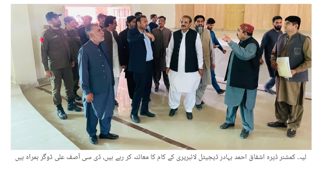 لیہ(نمائندہ لیہ ٹی وی )کمشنر ڈیرہ غازی خان ڈویژن اشفاق احمد چوہدری نے بہادر ڈیجیٹل لائبریری میں عرصہ دراز سے رکے ہوئے ترقیاتی کام کے دوبارہ آغاز کے حوالے سے دورہ کیا اور پیش رفت کا جائزہ لیا۔اس موقع پر ڈپٹی کمشنر لیہ آصف علی ڈوگر نے منصوبے کی موجودہ صورتحال اور آئندہ لائحہ عمل پر تفصیلی بریفنگ دی۔کمشنر اشفاق احمد چوہدری نے بہادر ڈیجیٹل لائبریری کے منصوبے کو تعلیمی ترقی کے لیے اہم قرار دیتے ہوئے ضلعی انتظامیہ لیہ کی کاوشوں کو سراہا اور ہدایت کی کہ کام کو بروقت اور معیاری انداز میں مکمل کیا جائے۔